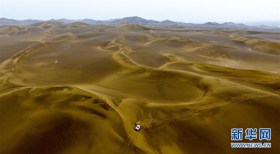 2018年6月4日,赛车在库木塔格沙漠腹地行驶。 当日,2018中国环塔(国际)拉力赛在位于新疆鄯善县境内的库木塔格沙漠展开第二赛段角逐。赛段全长约297公里。 新华社记者江文耀摄