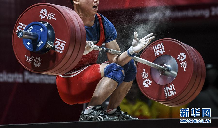 2018年8月21日,越南选手郑文荣在比赛中出现失误。 当日,第18届亚运会男子举重62公斤级决赛在雅加达举行。 新华社记者潘昱龙摄
