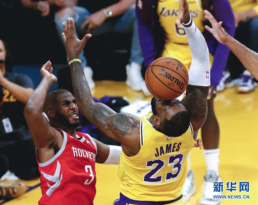2018年10月20日,湖人队球员勒布朗·詹姆斯(右)在比赛中上篮受阻。 当日,在2018-2019赛季NBA联赛常规赛中,洛杉矶湖人队主场以115比124不敌休斯顿火箭队。 新华社发(赵汉荣摄)