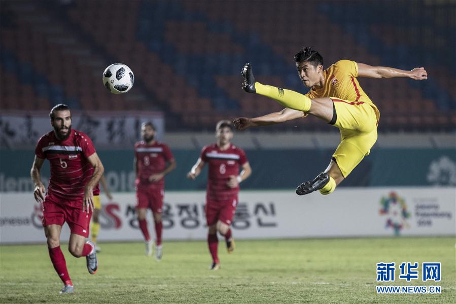 2018年8月16日,中国队球员张玉宁(右一)在比赛中射门。 当日,在第18届亚运会男子足球C组小组赛中,中国队以3比0战胜叙利亚队。 新华社记者吴壮摄