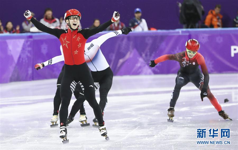 2018年2月22日,武大靖在比赛后庆祝。 当日,在江陵冰上运动场举行的2018年平昌冬奥会短道速滑男子500米决赛中,中国选手武大靖夺冠,这是中国代表团在本届冬奥会上的首枚金牌。 新华社记者韩岩摄