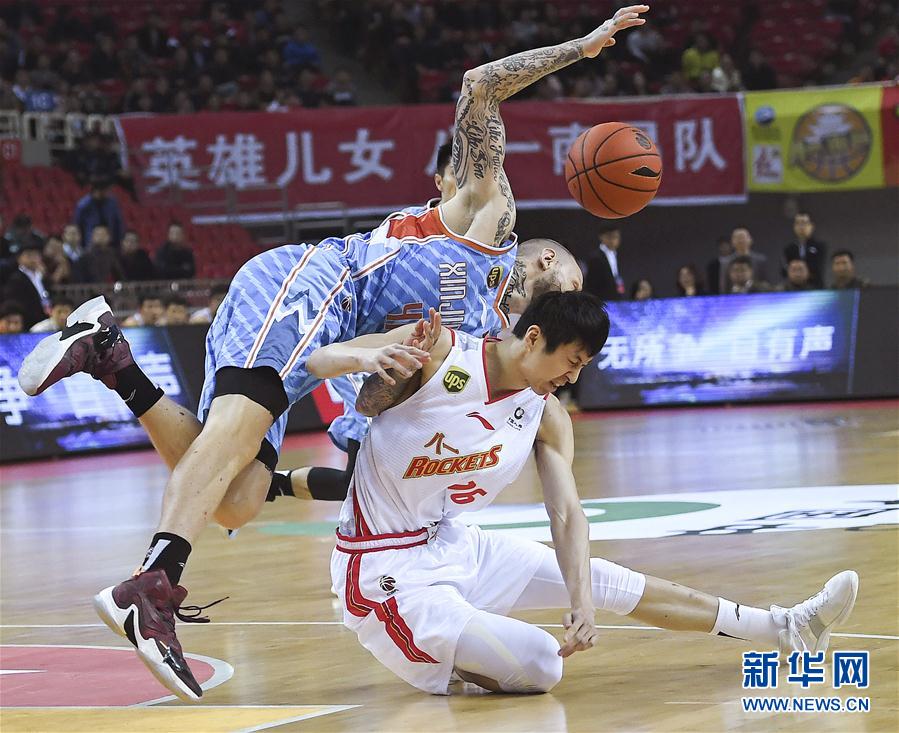 2018年11月23日,八一南昌队球员宁鸿宇(右)与新疆广汇汽车队球员明纳拉斯在比赛中争球。 当日,在2018-2019赛季中国男子篮球联赛(CBA)第15轮比赛中,八一南昌队主场以96比111不敌新疆广汇汽车队。 新华社记者万象摄