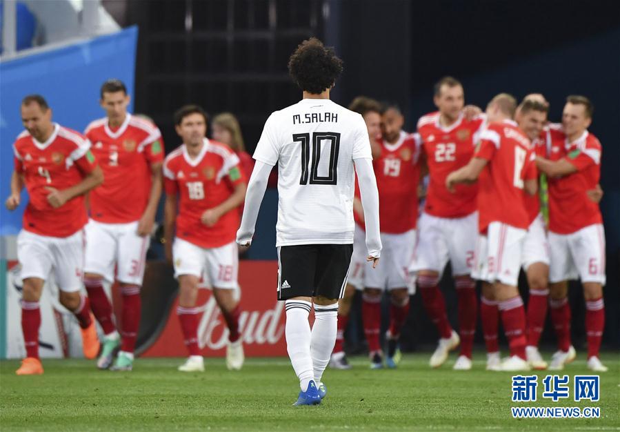 2018年6月19日,埃及队球员萨拉赫在比赛中注视俄罗斯队球员庆祝进球。 当日,在圣彼得堡进行的2018俄罗斯世界杯足球赛A组小组赛中,俄罗斯队以3比1战胜埃及队,取得两连胜。 新华社记者李尕摄