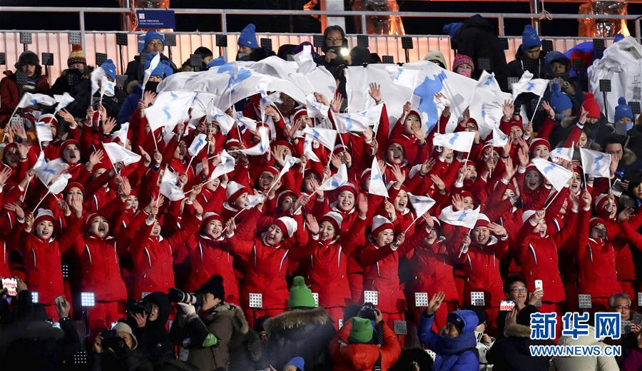 2018年2月9日,朝鲜拉拉队员在开幕式前。 当日,2018年平昌冬奥会开幕式在平昌奥林匹克体育场举行。 新华社记者李钢摄