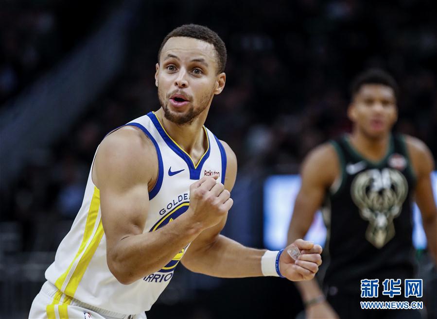 2018年12月7日,勇士队球员库里(左)在比赛中。 当日,在2018-2019赛季NBA季前赛中,金州勇士队客场以105比95战胜密尔沃基雄鹿队。 新华社发(乔尔·莱纳摄)