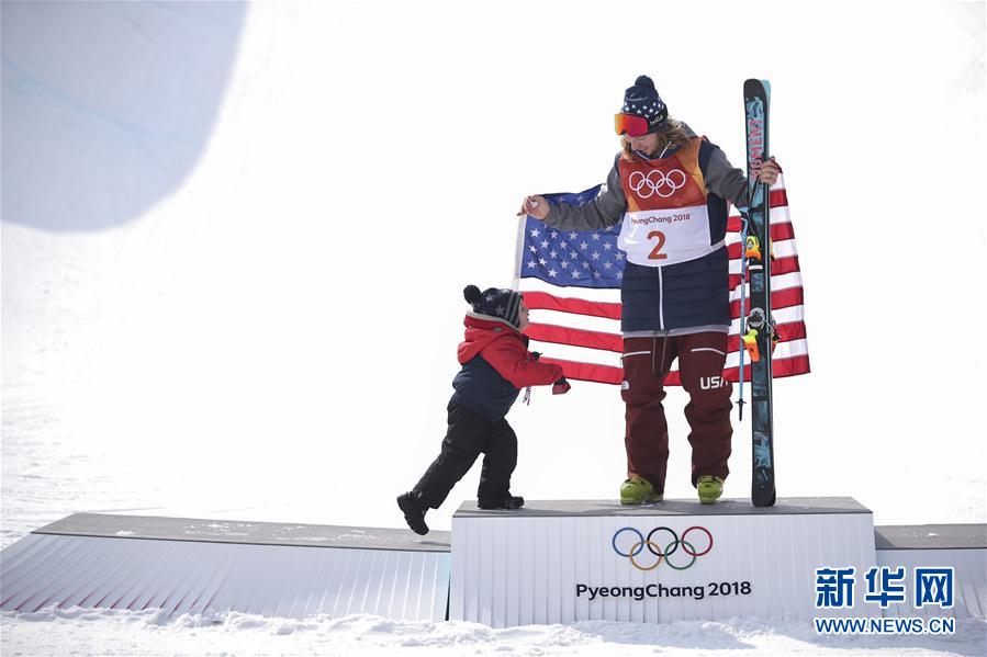 2018年2月22日,美国选手戴维·怀斯与自己的孩子在颁奖台上。 当日,2018年平昌冬奥会自由式滑雪男子U型场地技巧决赛在凤凰雪上公园举行。美国选手戴维·怀斯以97.20分的成绩获得冠军。 新华社记者费茂华摄