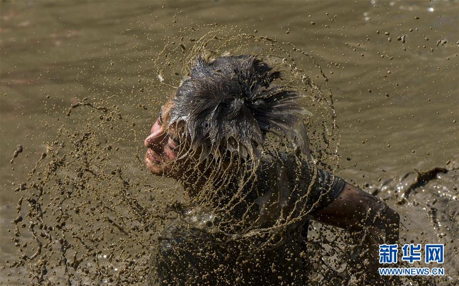 2018年8月26日,一名参赛者通过泥塘时甩去头发上的泥水。 当日,加拿大多伦多举办2018年“泥地英雄”挑战赛。赛事设有6公里、10公里越野跑挑战赛,吸引了数千名参赛者。 新华社发(邹峥摄)