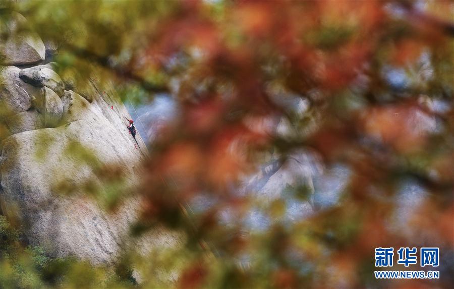 2018年10月21日,河南若克户外运动咨询有限公司队选手罗金创在男子组决赛中。 当日,2018中国攀岩自然岩壁系列赛(驻马店嵖岈山站)在河南省遂平县嵖岈山风景区闭幕。 新华社记者费茂华摄