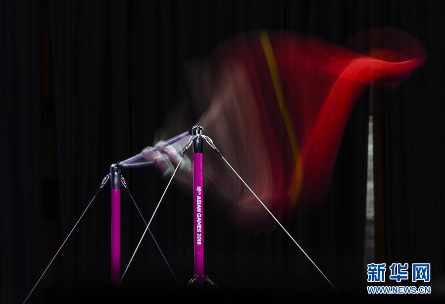 2018年8月24日,运动员在男子体操单杠决赛中。 当日,在印度尼西亚雅加达举行的第18届亚运会体操男子单杠决赛中,中国台北选手唐嘉鸿获得冠军。中国选手孙炜和肖若腾分获二三名。 新华社记者李响摄