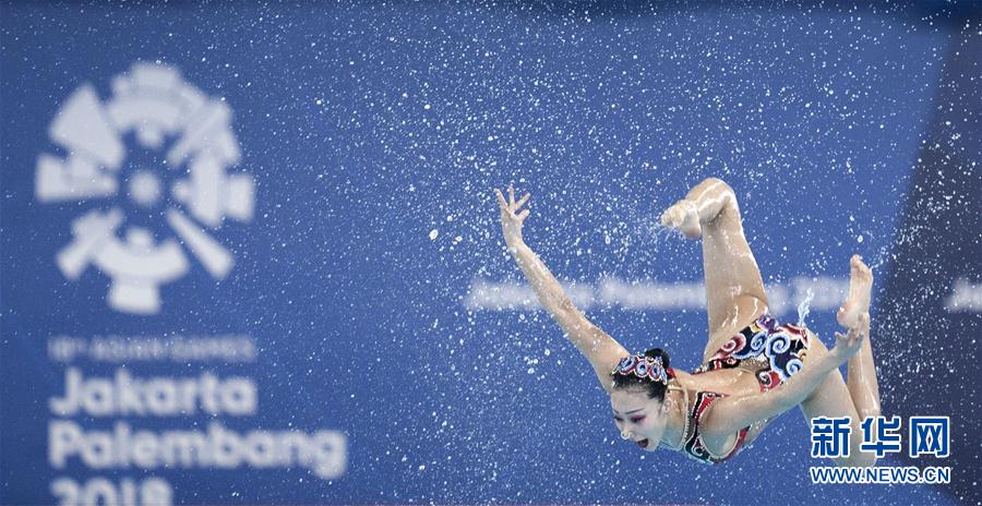 2018年8月29日,中国队选手在女子集体自由自选比赛中。 当日,在第18届亚运会花样游泳集体项目中,中国队以186.9395分的成绩获得冠军。 新华社记者费茂华摄