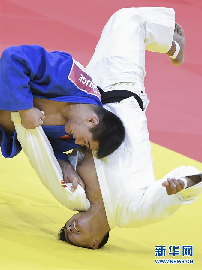 2018年9月1日,中国选手布和毕力格(上)在比赛中。 当日 ,在第18届亚运会柔道混合团体赛中,中国队战胜蒙古队晋级。 新华社记者李贺摄