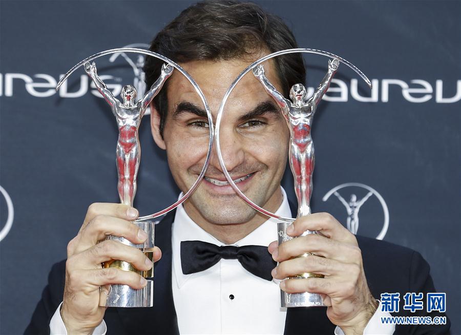 2018年2月27日,获得年度最佳男运动员奖和年度最佳复出奖的瑞士网球运动员费德勒展示奖杯。 当日,2018年劳伦斯世界体育奖各奖项在摩纳哥揭晓。 新华社记者叶平凡摄