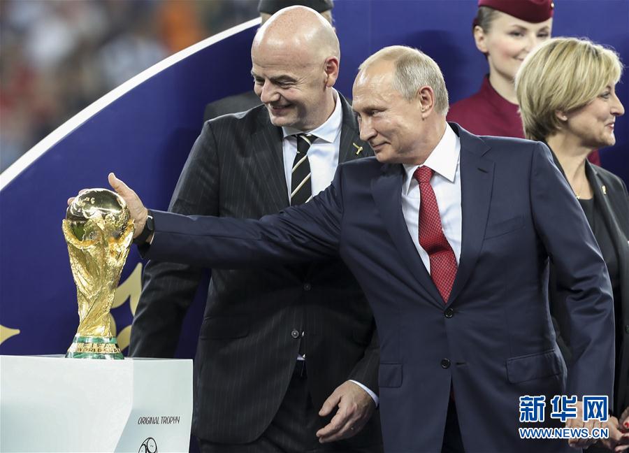 2018年7月15日,俄罗斯总统普京(前右)在颁奖仪式上抚摸大力神杯。 当日,在莫斯科进行的2018俄罗斯世界杯足球赛决赛中,法国队以4比2战胜克罗地亚队,继1998年后再夺世界杯冠军。 新华社记者费茂华摄