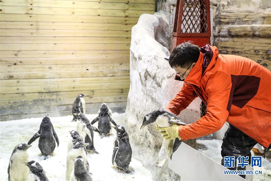 - 1月9日,驯养员准备给白眉企鹅宝宝喂食。 新华社记者 潘昱龙 摄