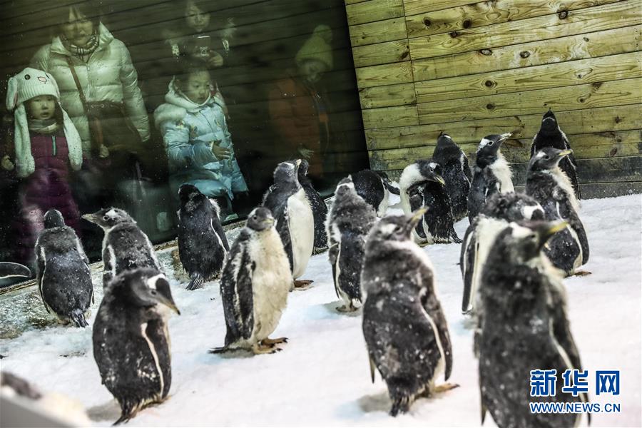- 1月9日,驯养员给白眉企鹅宝宝喂食,成年白眉企鹅在隔离板外关注自己的宝宝。 新华社记者 潘昱龙 摄