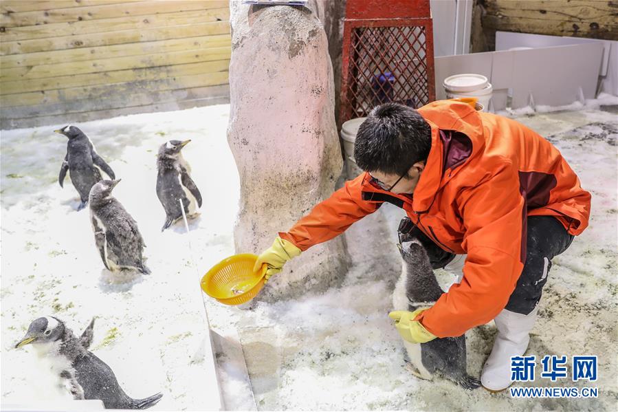 - 1月9日,驯养员给白眉企鹅宝宝喂食。 新华社记者 潘昱龙 摄