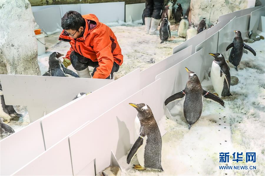- 1月9日,驯养员给白眉企鹅宝宝称重。 辽宁大连圣亚海洋世界有一个专门帮助企鹅宝宝学习成长的特殊“幼儿园”,白眉企鹅宝宝要在这里学会独立吃鱼、游泳等技能后才可以“毕业”。 自然界中,企鹅成长到一定年龄就会和父母分开,独立生活。为了模拟企鹅自然繁育的生长环境及规律,大连圣亚海洋世界每年都会将适龄企鹅集中到企鹅“幼儿园”,与父母分离,学习独立生存技能。 据介绍,现阶段企鹅宝宝们和父母还处于初步隔离阶段,只有一“墙”之隔,等到适应期一过,它们要离开企鹅们生活的圣亚南极企鹅岛,进行专门的封闭学习。在“幼儿园”度过三个月左右的时间以后,小企鹅就可以“毕业”重新回到企鹅岛,与成年企鹅一同生活。 新华社记者 潘昱龙 摄