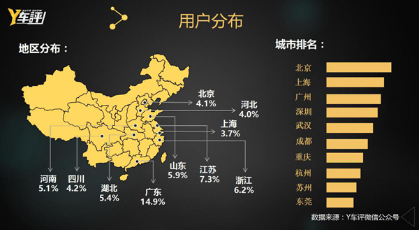 而从用户地域占比上,Y车评已经成功走出中部地区,辐射全国各地,广东(占15%)、江苏(占7%)、浙江(占6%)、山东(占5。8%)、湖北(占5%)、四川、北京、河北(占4%),用户中有超过50%的年龄处于25-40岁之间。