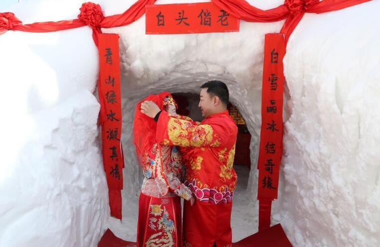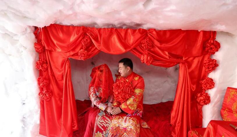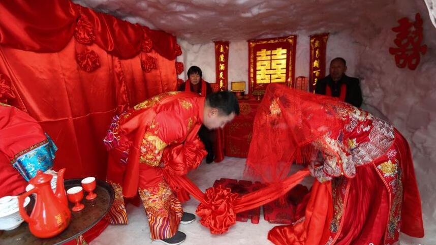 - 1月19日,河南栾川伏牛山滑雪场,员工郭女士大婚之喜,单位的能工巧匠们就地取材,花三天时间在雪包上为其挖了一个浪漫雪屋洞房,里面布置得精美绝伦,有客厅,有卧室,客厅里摆放着桌子和椅子,用喜庆的红布装点,桌子上点着红蜡烛,还摆放寓意着“早生贵子”的果品,在客厅的侧面,还有一个幕帐,里面陈设着一张冰雪床榻,上面铺着喜庆的红被褥,不禁令人叫绝,他们笑称这个是送给新人的“一室一厅”。古典传统的婚礼仪式结束后,新郎新娘又在雪地上摆起火锅长桌宴待客,亲友们围坐两旁感受着冰火两重天,脚下是皑皑白雪、桌上是热气腾腾的火锅,欢声笑语,其乐融融。中新社记者王中举摄