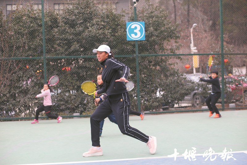 在市体育中心网球训练场,郑钦文耐心指导十堰小队员们挥拍的动作。