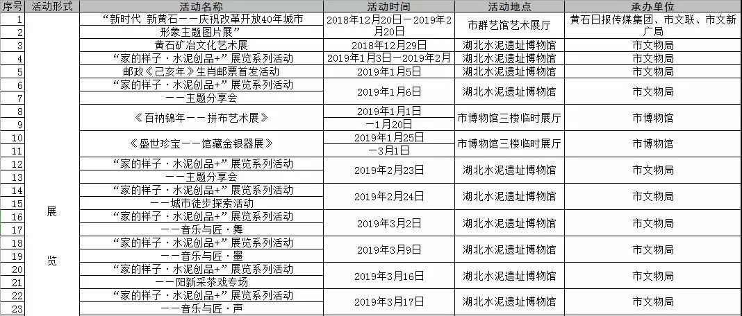 春节期间黄石公共文化场馆正常免费开放,在市图书馆、湖北水泥遗址博物馆、市博物馆,市民可观赏到“品书香 赏年俗”年俗文化展、“家的样子·水泥创品+”展览、金银器展等展览。