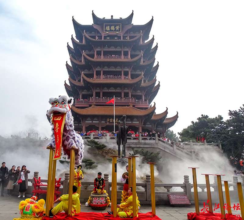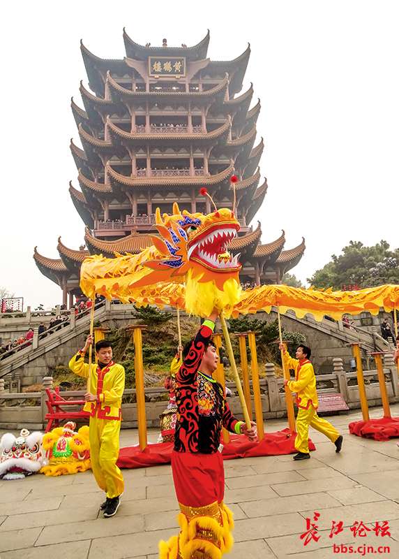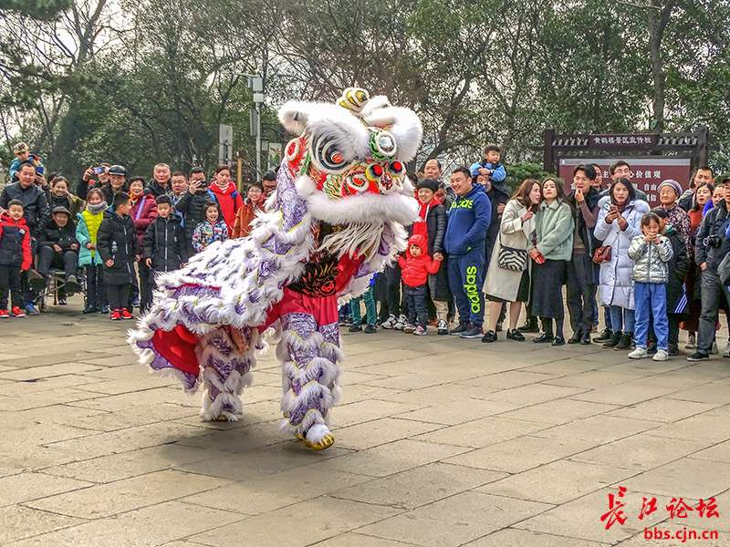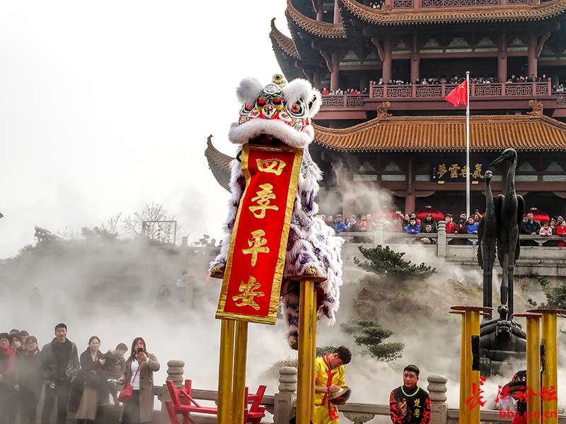 长江网2月6日讯(i记者陈苏建)2019年2月5日农历己亥年大年初一,黄鹤楼景区熙熙攘攘,黄鹤楼下的舞狮、舞龙嗨翻天,热热闹闹喜迎己亥年新春。一条大龙和几头大狮子欢腾跳跃,辗转腾挪,为节日平添了许多喜庆和热闹。精彩的传统舞龙、舞狮表演,受到了现场游客的阵阵喝彩和点赞。