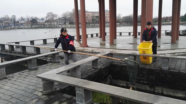冒着凛冽的寒风,黄敏莉带领同事来到莲花湖畔,清理完路面的垃圾后,重点打捞湖面的垃圾。一根3米多长的竹竿,配上一个特制的网兜,一个人捞,一个人拖着特制的垃圾桶跟在后面。垃圾多的时候,黄敏莉就要肩扛着装满垃圾的网兜,绕着湖边走上数百米。“一网垃圾带水,最少也有10多斤,碰上死鱼什么的,一网有30多斤。一趟下来,肩膀会磨破皮”,黄敏莉说。