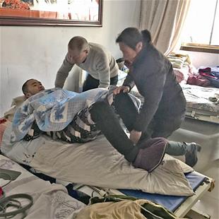 王福智今年68岁,梁金凤今年67岁,过度操劳让他们显得比同龄人要苍老。记者来到他们家中时,老两口正在帮王磊进行康复按摩(如图),一个抱一个抬,将儿子从轮椅抬起站立在床上后,梁金凤又为王磊僵硬的腿部按摩。在给儿子进行康复按摩期间,老两口给记者讲起了他们的家事和要感谢的好心人。