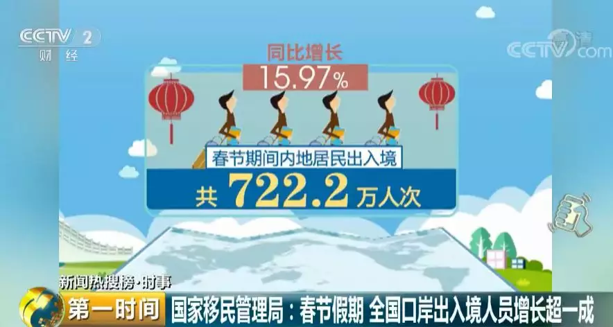 春节期间内地居民因私出入境增长最为明显,共722.2万人次,同比增长15.97%。