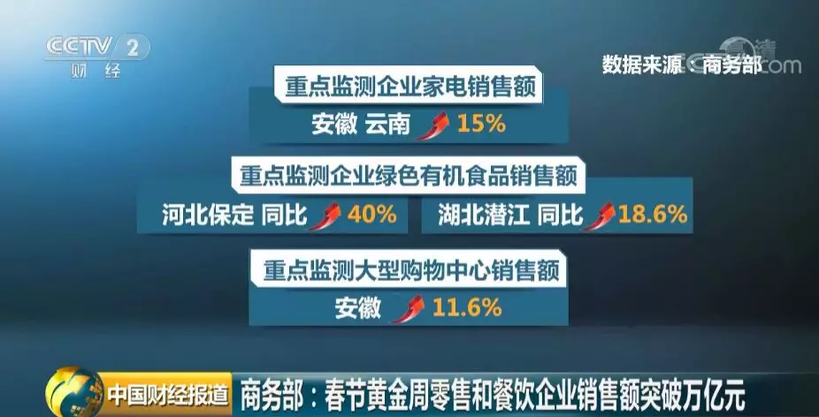 安徽、云南重点监测企业家电销售额增长15%左右。河北保定、湖北潜江重点监测企业绿色有机食品销售额同比分别增长40%和18.6%。安徽重点监测大型购物中心销售额增长11.6%。