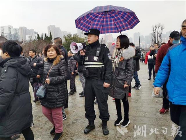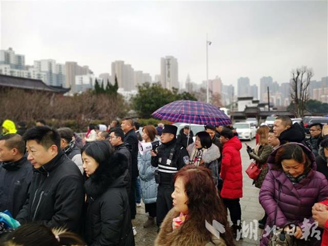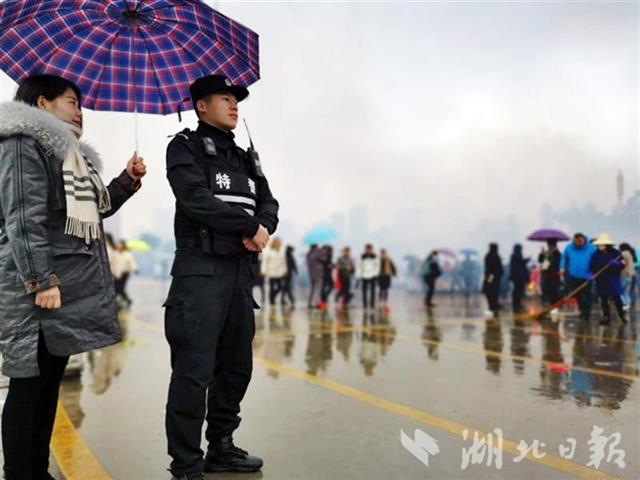 没想到,正月初五清早,朱敏驱车6小时,从400公里外来到归元寺。在寒风冻雨中,见到丈夫警容严整地站在人群中,手持扩音器大声疏导人流,朱敏的眼圈湿润了。她默默撑开伞站在了丈夫身后。
