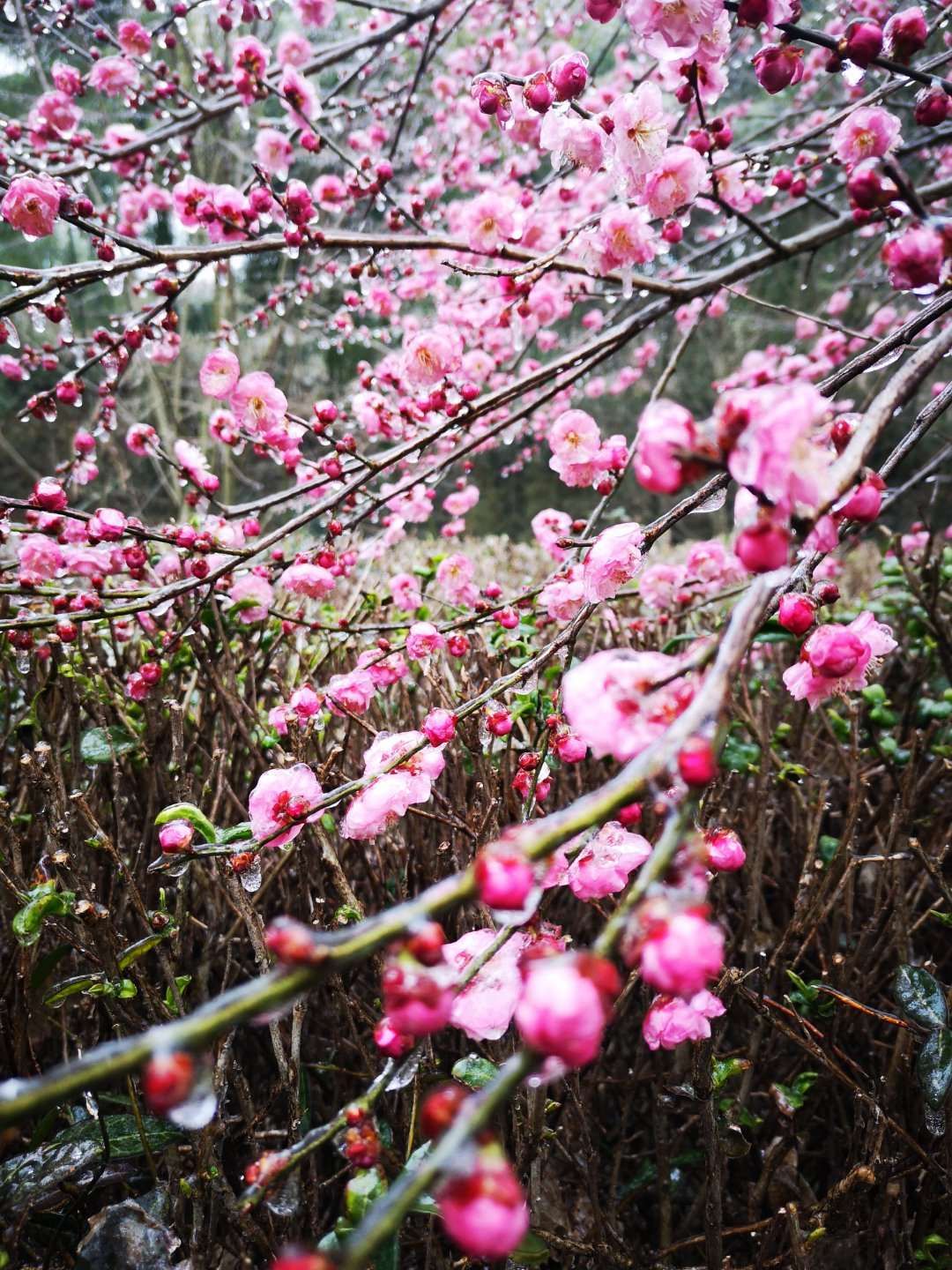 亮点:蜡梅、红梅和美人梅。近日天气转凉,不少红梅和含着骨朵的美人梅被裹上一层白霜,带着股“欲语还休”的味道。