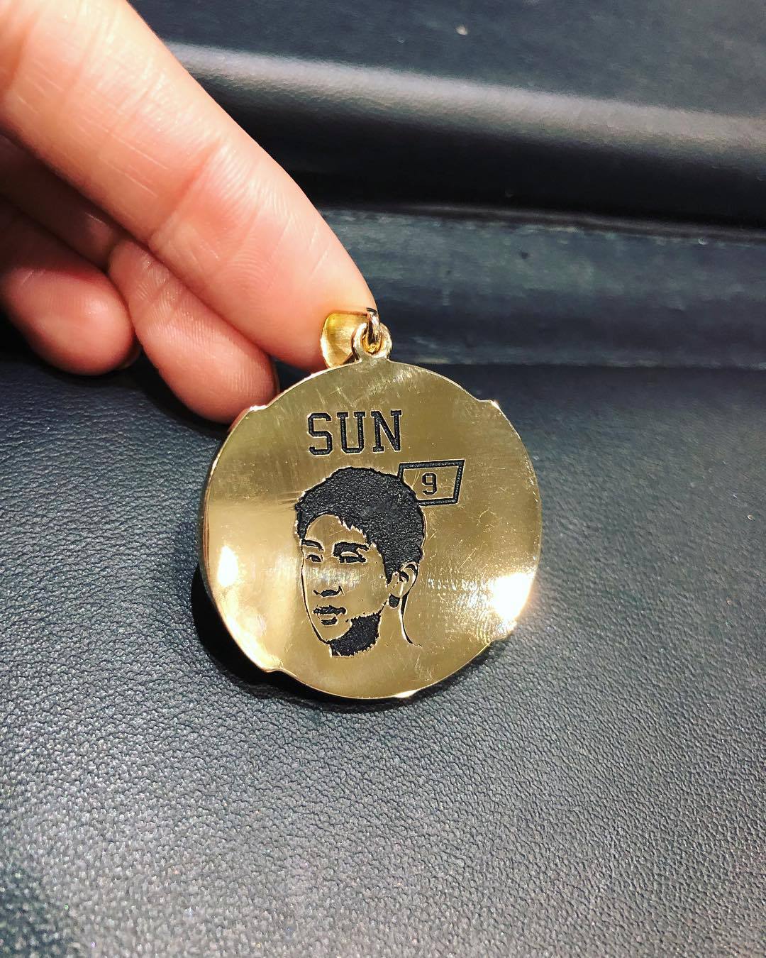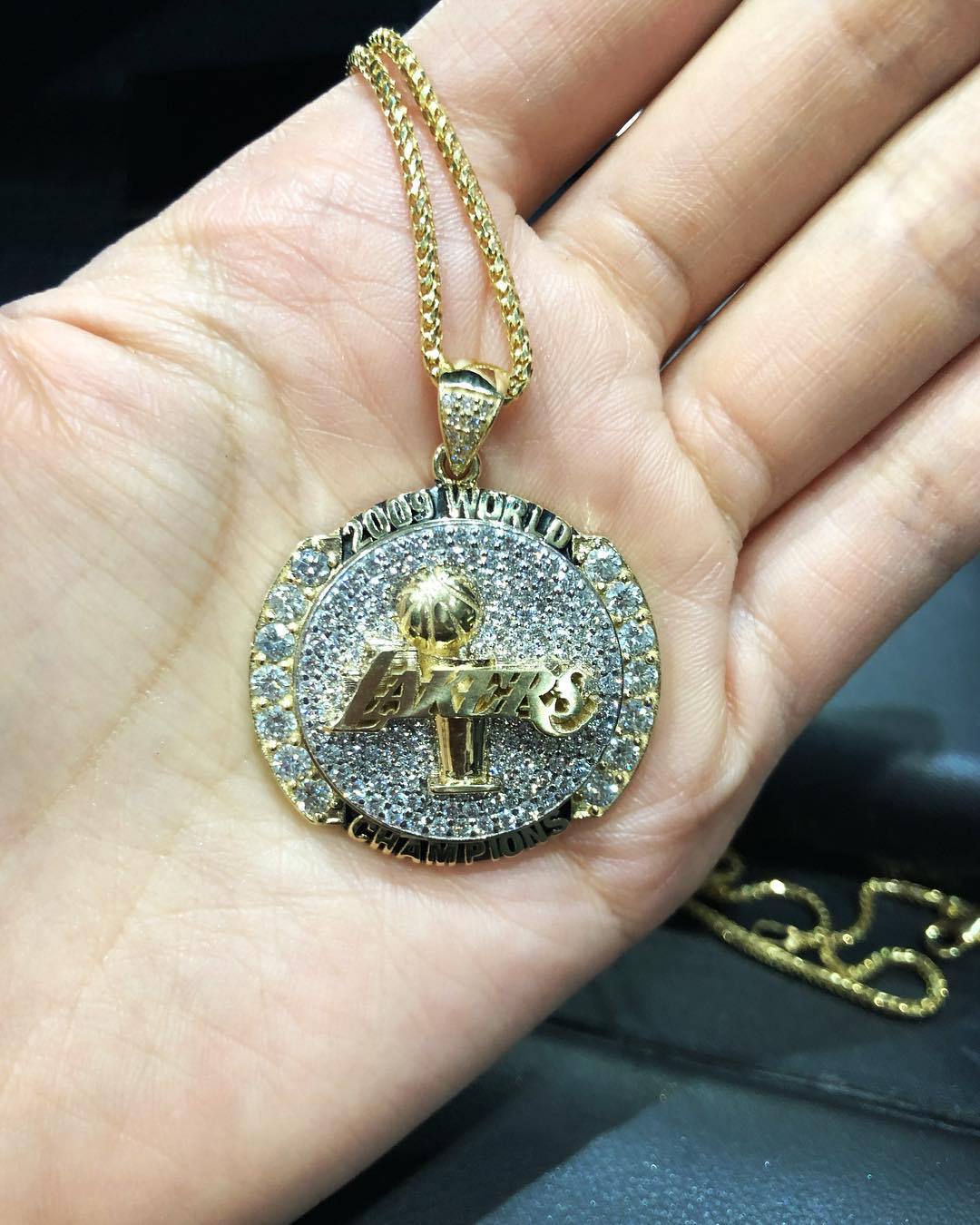 这条项链上刻着“2009年世界冠军(编者:NBA冠军队习惯称自己是世界冠军)”,中间则是一个湖人标志和奥布莱恩杯的浮雕图形。两侧的钻石更是光彩夺目。看得出来,这应该与总冠军戒指同种设计风格的产品,而这块圆形吊牌背后,则是孙悦的脸部特写,他的姓氏和号码也刻了上去。