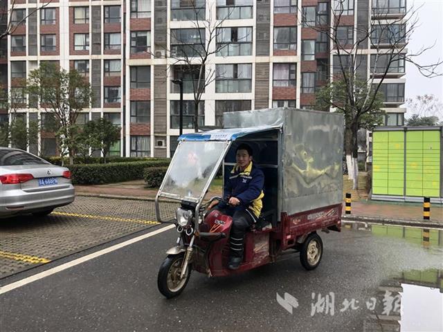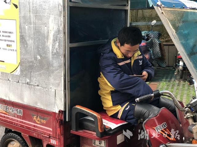 7点28分,刘涛带上帽子,绑上护膝,骑上装着42个包裹的小三轮,出门送快递。湖北日报全媒记者一路跟随。