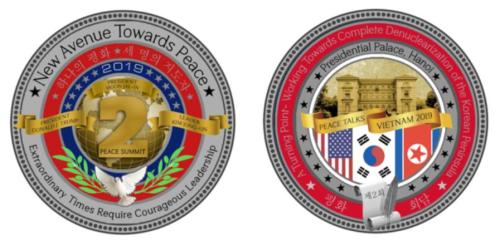 白宫纪念品店推出的第二次“特金会”纪念币,正面印有“2”,和两国领导人的名字,以及“迈向和平的新路”(New Avenue Towards Peace)。背面则有美国、朝鲜、越南3国国旗,与“2019越南和平对话”(PEACE TALKS VIETNAM 2019)、“第2次”等字。