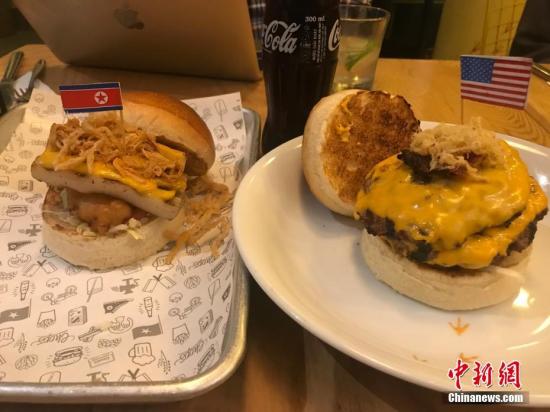 当地时间2月25日,越南河内一家餐厅特地推出两款以金正恩、特朗普为主题的汉堡招徕顾客。中新网记者 孟湘君 摄