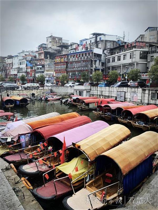 马路对面的湖面,还停泊着色彩斑斓的游船。