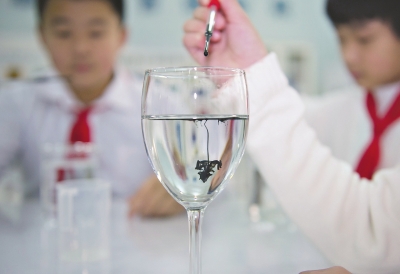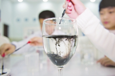 教室里有墨、墨盘、滴管、颜料、容器、平板电脑、打印机,同学们体验用不同的方式滴墨,塑造出不同的美,捕捉水墨交融时的精彩瞬间,并用电脑软件制作成明信片。大家专注地将墨滴入玻璃杯里,用清与浊、浓与淡的交织创造出独特的水中晕染效果。