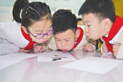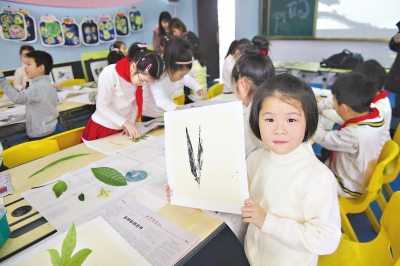 一年级的孩子用树叶和油墨,体验拓印画的乐趣;三年级的学生用嘴巴或吸管,将墨水吹成奇妙的画作;五年级学生通过学习与墨有关的诗词,引发对古代制墨工艺、制墨工匠的探究;六年级学生结合科学知识用清与浊、浓与淡制造出水中墨的晕染美景……2月27日,汉阳区墨水湖小学的孩子们用不同的方式,学习校本课程《墨韵流彩》。