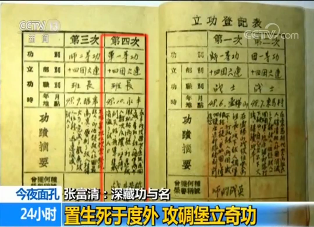 张富清的这本“立功证书”里,有一张“立功登记表”,上面清楚地记录了他在解放战争时期立下的三次一等功和一次二等功。这其中,除了团级和师级的军功,张富清立下一次军级一等功,被授予“战斗英雄”称号。
