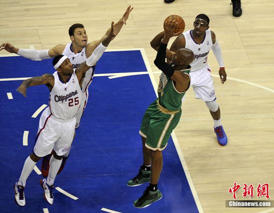 资料图:雷-阿伦(绿)代表凯尔特人比赛中。中新社记者 毛建军 摄