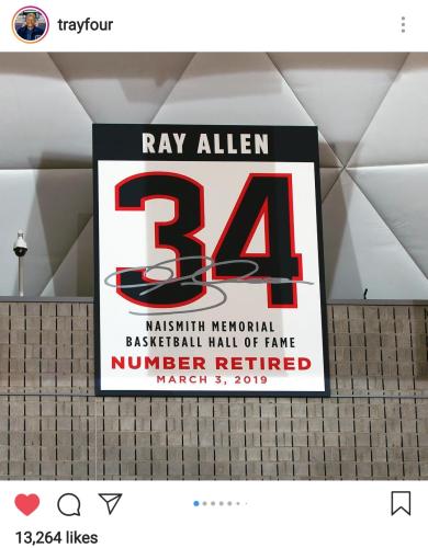 雷-阿伦在自己的社交媒体上传了被退役的球衣图片,并写道“此前我的球衣还没有在任何一个级别的篮球联赛退役,这一时刻我永远难忘。”