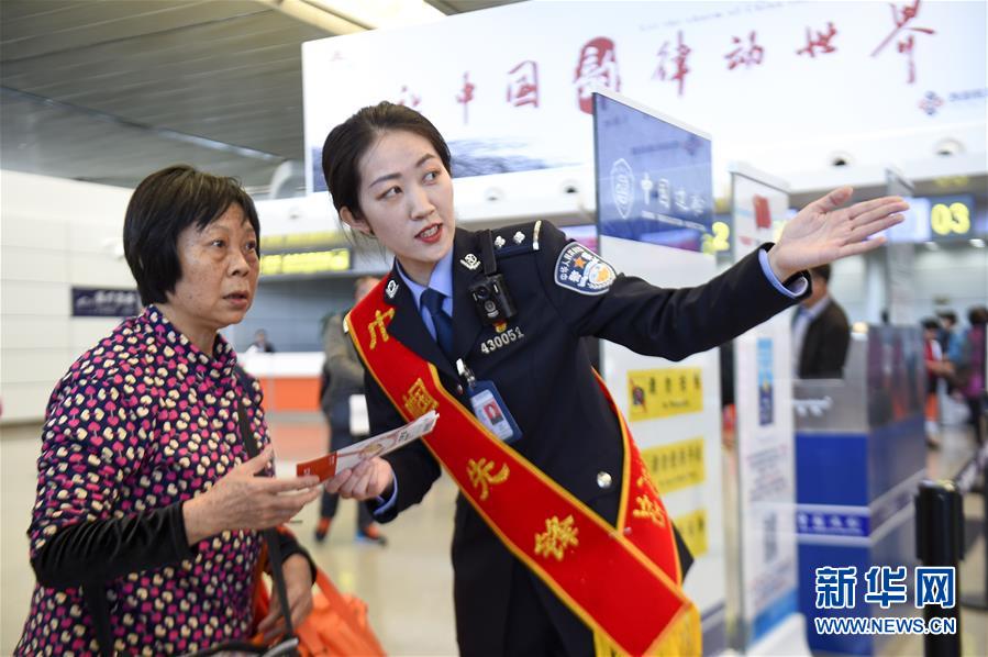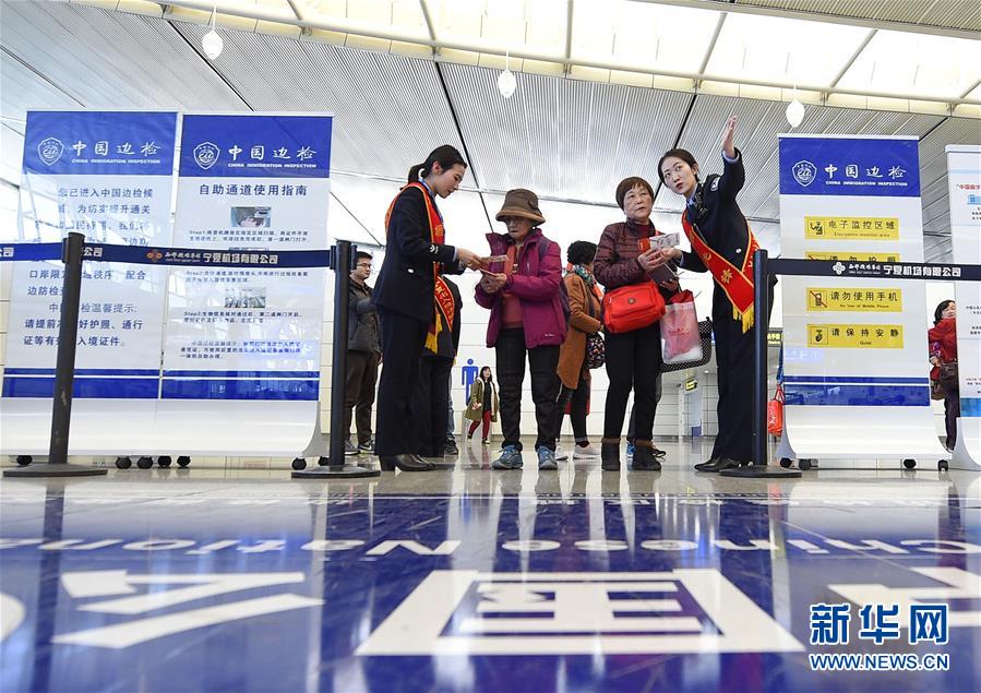 3月5日,宁夏出入境边防检查总站的女警引导出境旅客有序通关。