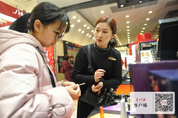 春节期间,顾客在武商广场化妆品专柜选购(资料图)。记者苗剑 摄
