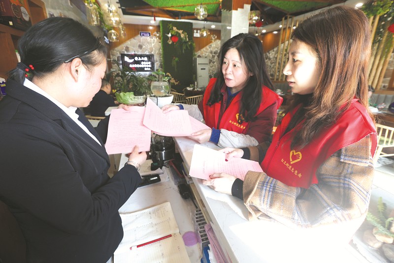 昨日,张湾区红卫街办燕沟社区工作人员在辖区酒店内发放“光盘行动”宣传资料。据了解,为大力普及文明餐桌知识、推广文明餐桌礼仪,该社区工作人员走街串巷,督促指导辖区餐饮企业和居民积极参与文明餐桌创建活动,使节俭用餐、文明用餐习惯深入人心。记者刘旻摄