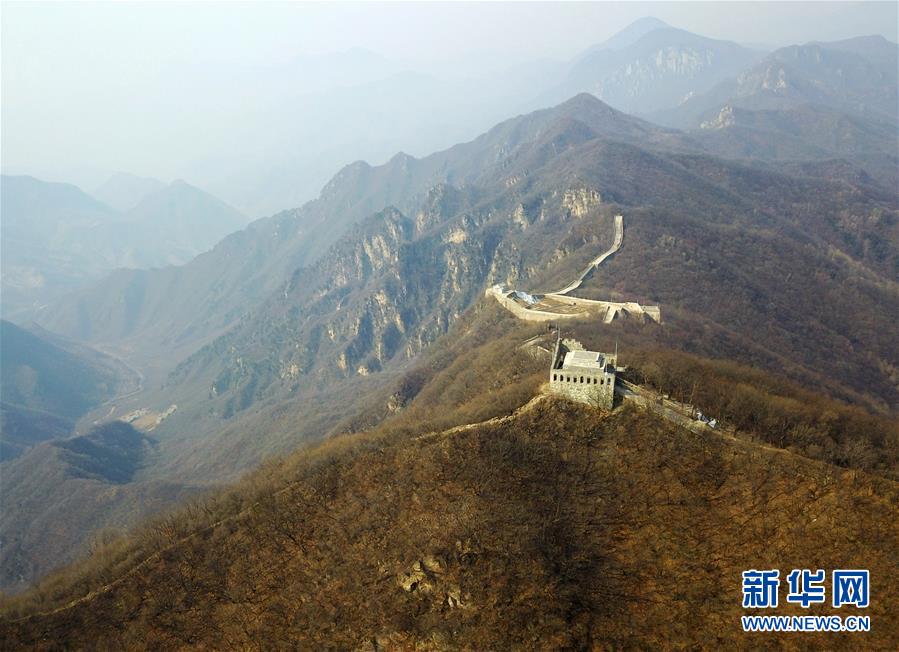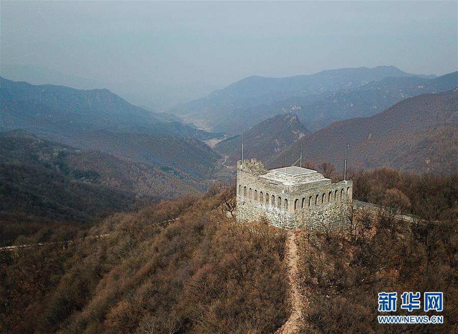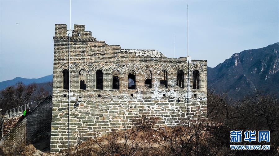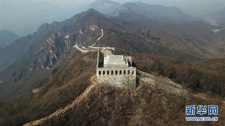 这是3月18日无人机拍摄的九眼楼长城。 九眼楼长城位于北京市延庆区四海镇,该楼是明代长城中建筑规模和形制最大的一座敌楼,因楼体为青砖砌筑,每边并排九个箭窗,故称“九眼楼”。 新华社记者 张晨霖 摄