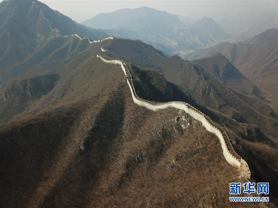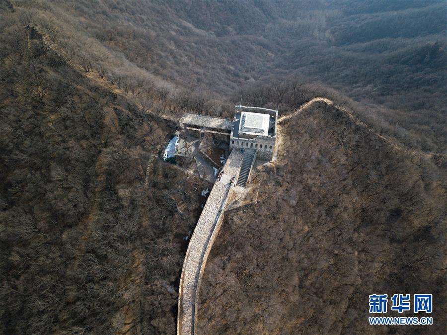 这是3月18日无人机拍摄的九眼楼长城。 九眼楼长城位于北京市延庆区四海镇,该楼是明代长城中建筑规模和形制最大的一座敌楼,因楼体为青砖砌筑,每边并排九个箭窗,故称“九眼楼”。 新华社记者 孟晨光 摄