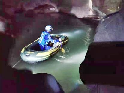 图为16日事发当晚队员再次打探照灯划橡皮艇搜寻水潭
