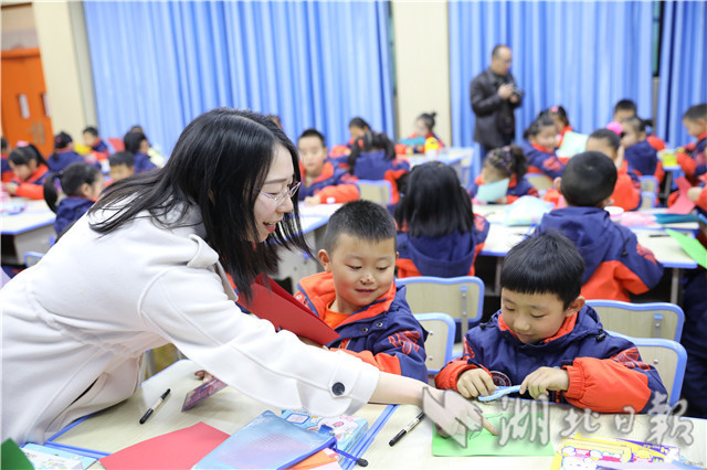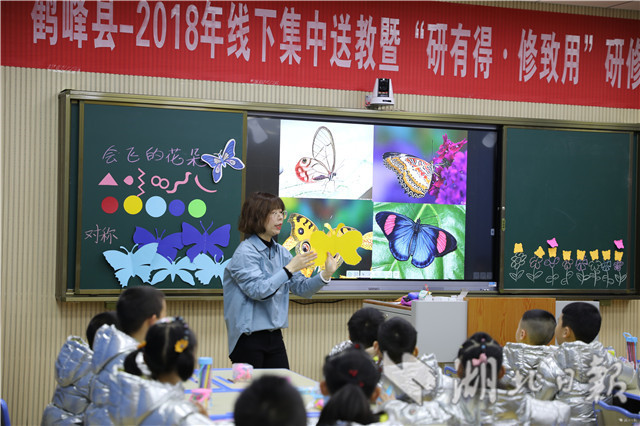 3月22日,鹤峰县思源实验学校录播室里,武汉市硚口区优秀青年教师赵琴在指导孩子们折剪蝴蝶。当日,湖北省国培项目的7名送教专家来到鹤峰县,通过专题讲座、同课异构、说课评课、案例分享等形式,对来自该县各中小学的150余名美术老师集中培训,面对面地解决山区美术老师的疑难与困惑,促进教师专业化成长,让山里娃享受公平而有质量的教育。(视界网汪正玺摄)