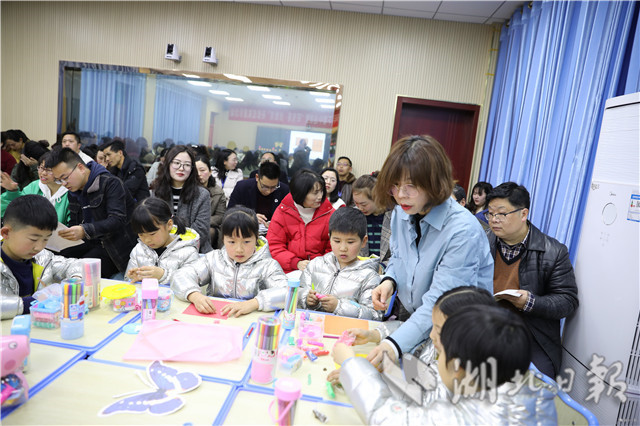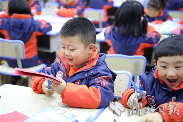 3月22日,鹤峰县思源实验学校录播室里,孩子们学折剪蝴蝶。
